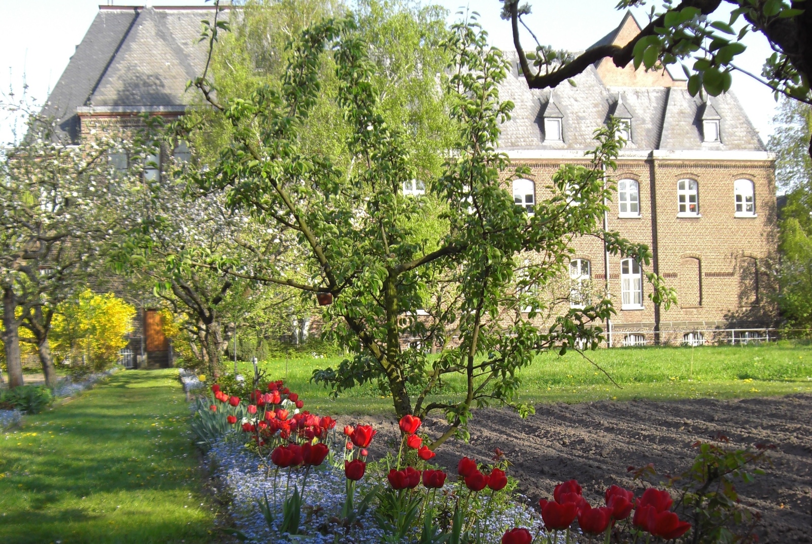 Ein kleines Garten-Kapellchen, versteckt hinter einem prächtig tragenden Apfelbaum: Hier liegt unsere Gründerin, Mutter Josephine von Fürstenberg-Stammheim, begraben. Sie war Priorin von vier Klöstern und lebte kurz vor ihrem Tod hier bei uns in Köln-Raderberg.