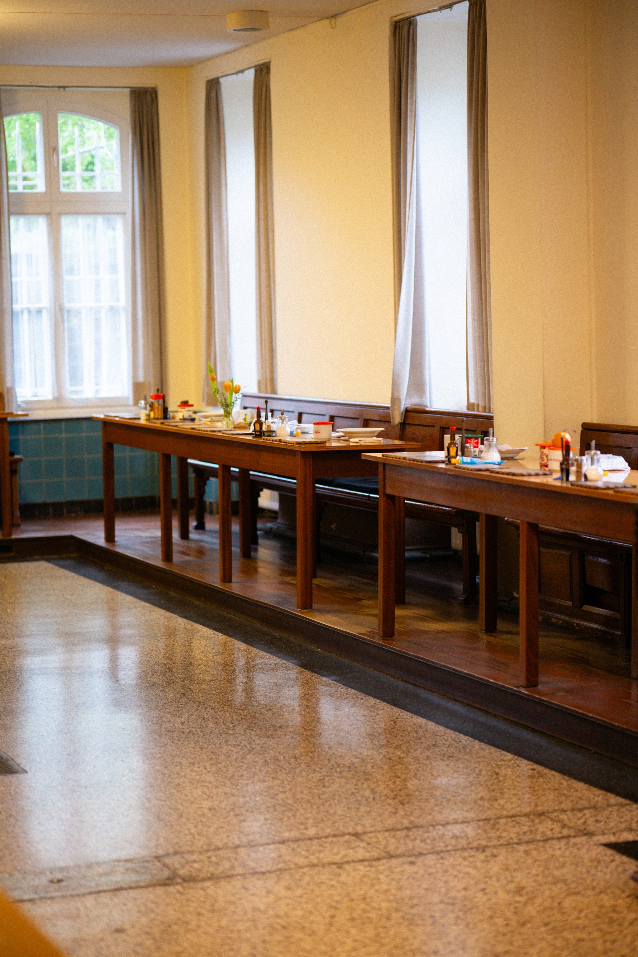 Das Refektorium (lat: refectorium, der „Ort der Erquickung“) ist der Speisesaal unseres Klosters. Jede Schwester hat in dem schlichten, aber würdevollen Raum ihren persönlichen, festen Platz – in einer „U“-Sitzordnung. Denn wir nehmen die Mahlzeiten stets gemeinsam, jedoch in Stille ein. Dabei liest eine Schwester aus den spirituellen Werken unserer Klosterzweig-Gründerin [verlinken mit der Geschichte Mutter Mechthildes]. Diese Form erleichtert zudem den Dienst am Tisch, wenn die zuständige Schwester uns das Essen reicht.