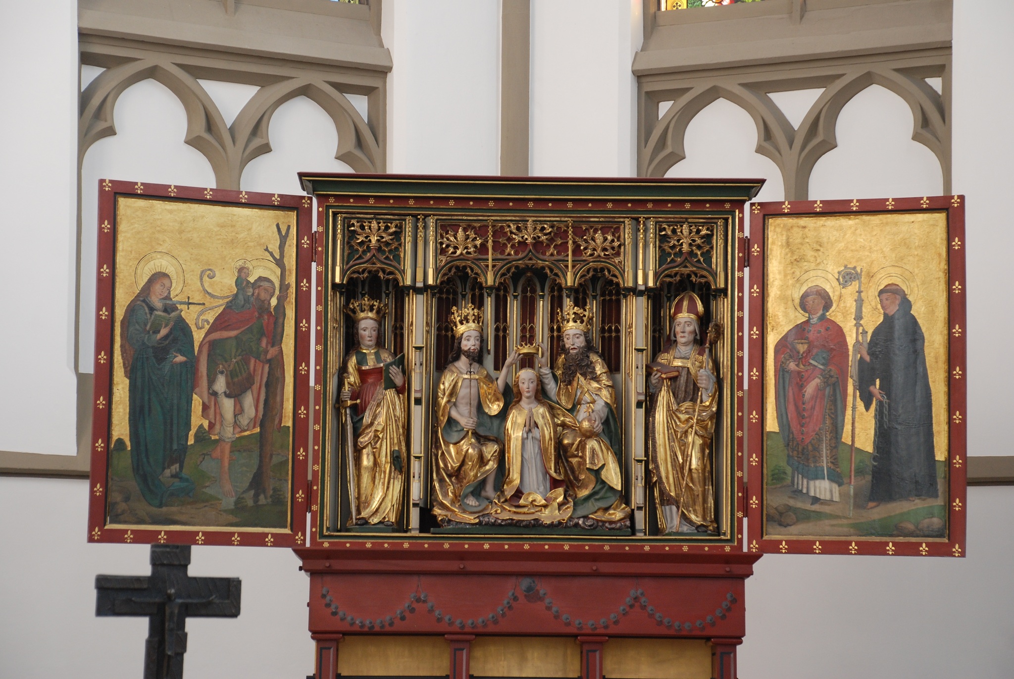 Auf dem Retabel, der kunstvoll geschnitzten Altarrückwand, ist die Szene „Die Krönung Mariens“ dargestellt. Sie erzählt von der Aufnahme der Mutter Gottes in den Himmel – und schenkt uns Christen Hoffnung auf die ewige Herrlichkeit. Diese himmlische Perspektive feiert die Katholische Kirche jährlich am 15. August. -