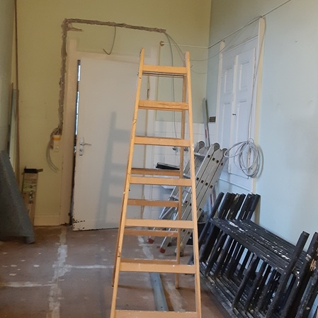 Die Pforte, der Eingangsbereich unseres Klosters, wird derzeit umgebaut; für unsere immer zahlreicheren Gäste entstehen zusätzliche sanitäre Einrichtungen. Dafür müssen wir einige Räume verkleinern, Wände einziehen und neue Türen setzen. Die handwerklichen Arbeiten übernehmen Fachleute; einzelne Aufgaben aber auch wir Schwestern – je nachdem, was jede von uns gut kann. So leben wir ganz im Geist des heiligen Benedikt: „Sie sind dann wirklich Mönche, wenn sie von ihrer Hände Arbeit leben.“ Unser herzlicher Dank gilt allen, die dieses Bauvorhaben bereits mit einer Spende unterstützt haben – und allen, die es noch tun möchten.