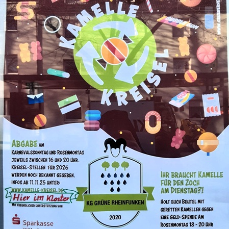 An Karneval regnet es auf uns Kölner Kamelle – rund 300 Tonnen Schokolade, Bonbons und Weingummi. Wenn Ihnen als Fuß-, Tanz- oder Musikgruppe noch Wurfmaterial fehlt oder Sie als Zuschauer viel zu viel geschnappt haben, gibt es eine schöne Lösung: den Kamelle-Kreisel. Unser Team der Lebensmittelausgabe freut sich Karnevalssonntag und Rosenmontag zwischen 16:00 und 20:00 Uhr auf Sie – ob zum Abholen oder Abgeben der Süßigkeiten. Was am Ende übrig bleibt, wird an Menschen, die Unterstützung brauchen, verteilt. Ihnen dafür ein kräftig‑kölsches Alaaf!